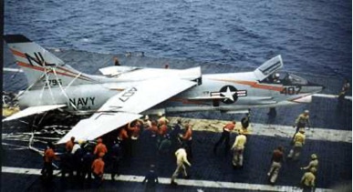 Well, as it turned out, I didn't lack for company. During our post-Korean pre-Viet Nam war work up and deployment we never fired a shot in anger. Nevertheless during this less than two-year cycle VF 154 lost a full squadron complement of 14 aircraft in major accidents as well as something like 40% of our pilots. We had a 20% fatality rate not including the unfortunate death of one of our crewmembers. Of something like 15 or 19 of us nuggets, only 2 were still flying by the end of the '58 cruise. An old squadron mate, Commander Dave Winiker was one of them-he went on to be a flight instructor and to fly hundreds of combat missions. Dave tells me that, in terms of pure hazard and pure flying thrills nothing ever compared to those pioneering CRUSADER days.